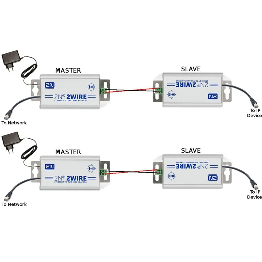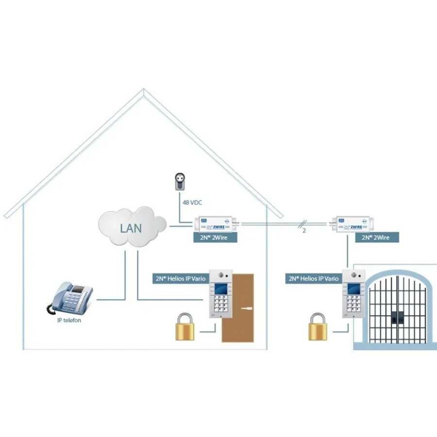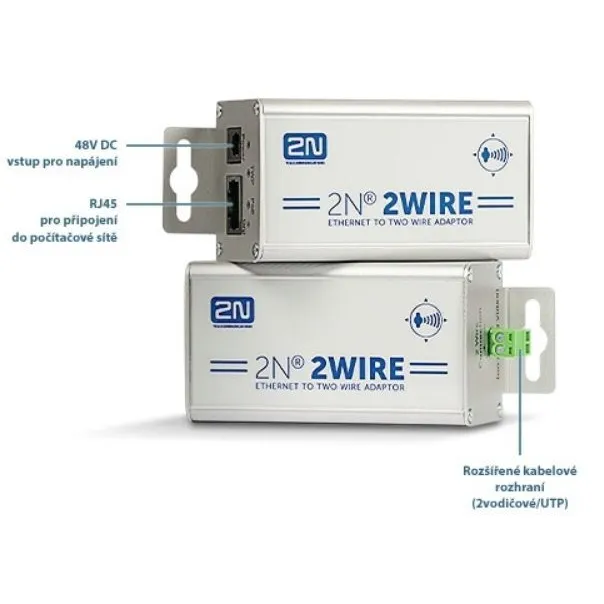Převodník 2N 2Wire Vám umožní použít stávající kabelové rozvody od původního zvonku či domovního telefonu a připojit na něj jakékoliv IP zařízení. Nemusíte nic konfigurovat, stačí pouze mít na každé straně kabelu jednu jednotku 2N 2Wire a připojit alespoň jednu z nich ke zdroji napájení. Jednotka 2N 2Wire pak poskytuje PoE napájení nejen druhému převodníku, ale i všem připojeným koncovým IP zařízením. Vyzkoušejte spolehlivý převodník 2N 2Wire a zapojte jakýkoliv interkom i tam, kde chybí IP síť. Získáte tak výhody a funkce špičkových IP interkomů od 2N jako jsou například streamování videa či integrace s mobilními zařízeními i v oblastech s jednoduchou infrastrukturou. Proč zvolit 2N 2Wire? • využití stávající infrastruktury • jeden kabel pro napájení a přenos dat • napájení připojeného IP zařízení přes PoE až do vzdálenosti 220 m • jednoduchá a rychlá instalace • nízké náklady Určeno pro • instalační firma • integrátor Technické parametry Rozhraní Ethernet Typ konektoru: RJ45 Rychlost: 10/100 Base T, poloduplexní/plně duplexní, auto-negotiation PoE: IEEE 802.3 af/at 40 W, PoE+ kompatibilní Rozšířené kabelové rozhraní (2vodičové/UTP) Typ kabelů: 2vodičové, Cat 5e, Cat 6 nebo podobné Impedance: 25 Ω až 100 Ω Dosah přenosu: max. 220 m (720 ft.) u Cat 6 Metoda přenosu Metoda přístupu: CSMA/CA a TDMA Metoda modulace: Windowed OFDM Frekvenční pásmo: 1,8 MHz až 30 MHz LED kontrolky Napájení: modrá - napájení zapnuto TWP: zelená - spojení zapnuto ( spojení mezi jednotkami je navázáno ) PoE: zelená - spojení zapnuto Střídavé/stejnosměrné elektrické napájení Střídavý vstup: 100 až 240 VAC , 50 až 60 Hz Stejnosměrný výstup: 48 VDC/0,84 A až 1,3 A Rozměry Rozměry (VxŠxD): 40 x 40 x 75 mm (1,57 x 1,57 x 2,95 in.) Hmotnost: 120 g (4,2 oz) Materiál: extrudovaný hliník Okolní podmínky Provozní teplota: -10 °C až +50 °C (+14 °F až +122 °F) Skladovací teplota: -30 °C až +70 °C (-22 °F až +158 °F)