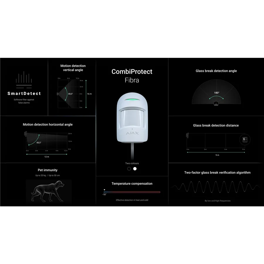 CombiProtect Fibra je drátový detektor pohybu s PIR senzorem o dosahu 12 metrů. Zařízení navíc disponuje senzorem rozbití skla na vzdálenost až 9 metrů od okna. Dvoufaktorová detekce v nízkých i vysokých frekvencích snižuje množství falešných událostí – poplach vyvolá pouze určitý sled zvuků, tedy tupý úder s následným tříštěním skla.