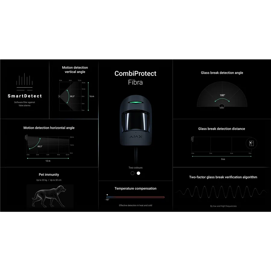 CombiProtect Fibra je drátový detektor pohybu s PIRsenzorem o dosahu 12 metrů. Zařízení navíc disponuje senzorem rozbití sklana vzdálenost až 9 metrů od okna. Dvoufaktorová detekce v nízkých i vysokých frekvencích snižuje množství falešných událostí – poplach vyvolá pouze určitý sled zvuků, tedy tupý úder s následným tříštěním skla.