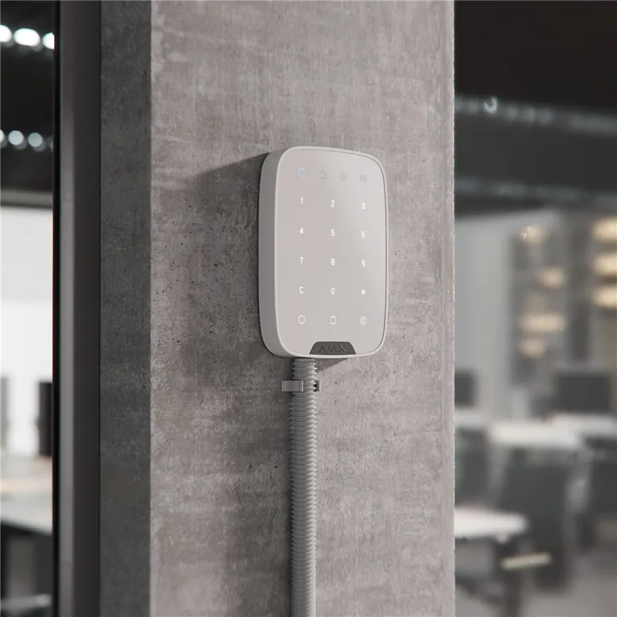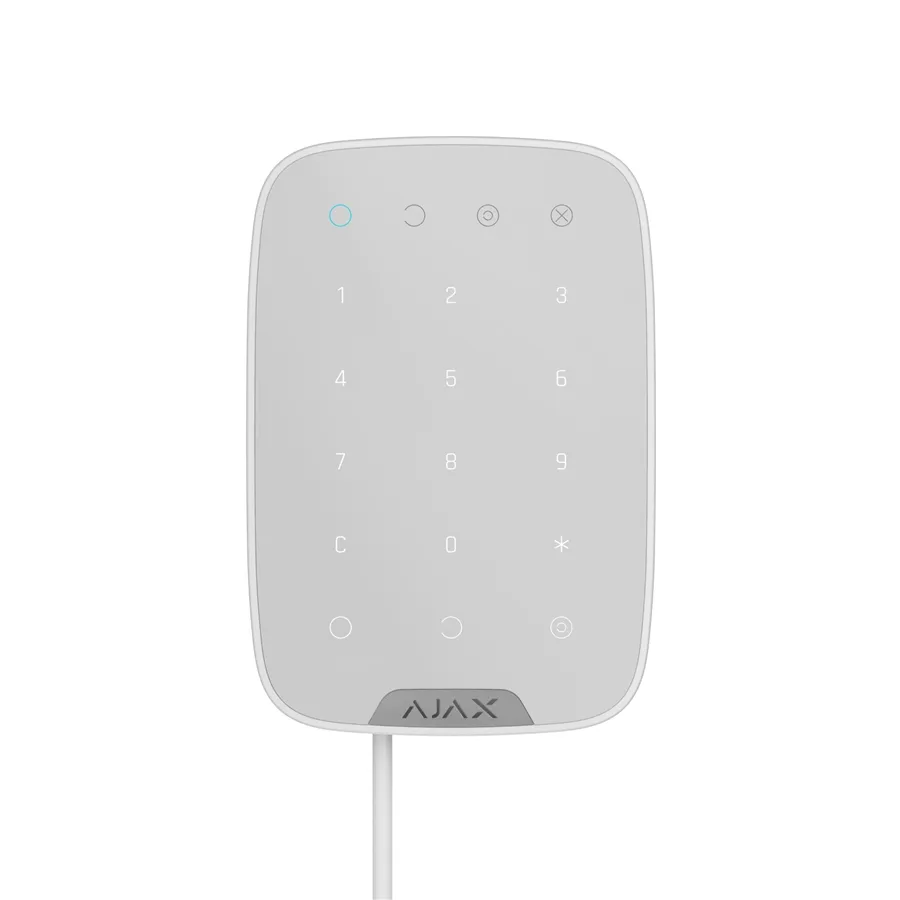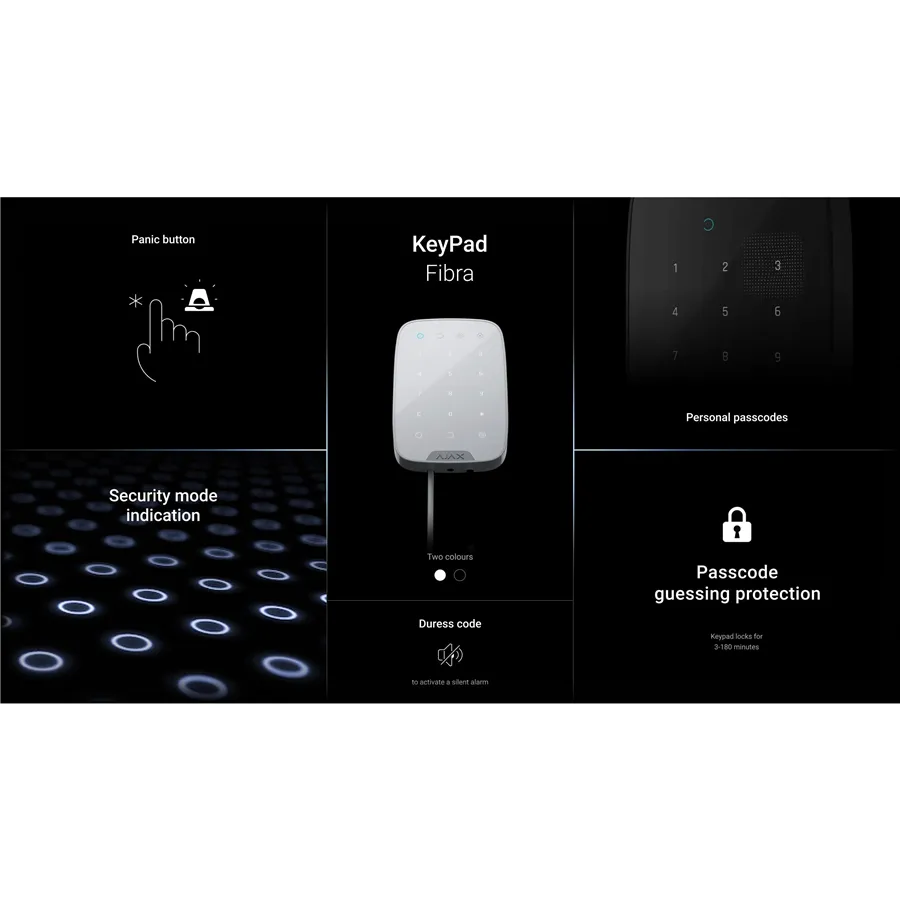 KeyPad Fibra je drátová dotyková klávesnice umožňující zastřežení/odstřežení zabezpečovacího systému Ajax zadáním kódu. V krizové situaci uživatel může na klávesnici diskrétně spustit tísňový poplach. Klávesnice je vybavena ochranou proti hádání hesla. Po třech neúspěšných pokusech o zadání kódu se zařízení uzamkne.