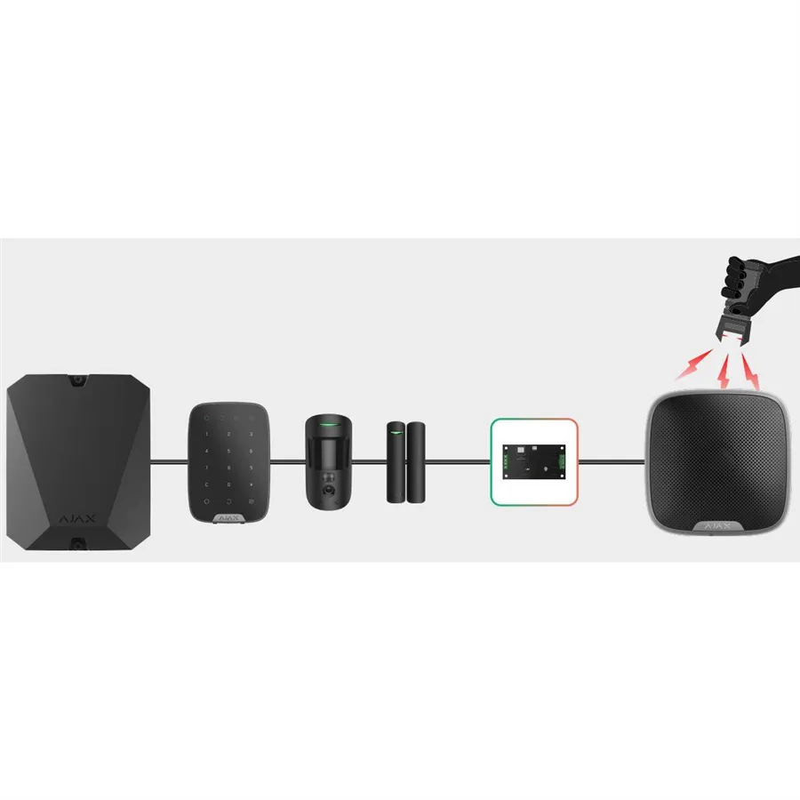 Modul LineProtect chrání ústředny a další drátová zařízení Ajax před zkratem. Zařízení zaznamenává vstupní a výstupní napětí, v případě vychýlení od normy dojde k přerušení el. energie do připojených zařízení.