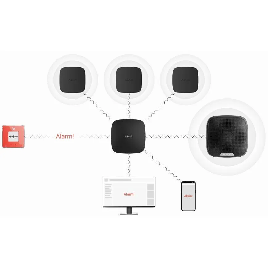 ManualCallPoint je bezdrátové tlačítko určené k vyvolání požárního poplachu. Po stisktnutí se spustí všechny požární detektory v systému a dojde k automatickému informování uživatele a CMS. Všechna relevantní data jsou okamžitě k dispozici v aplikaci Ajax, včetně informací o spuštění, času a místě. V případě život ohrožující situace dojde k aktivaci inovativních funkcí jako je odpojení zařízení, aktivace nouzového osvětlení a odemčení východů.