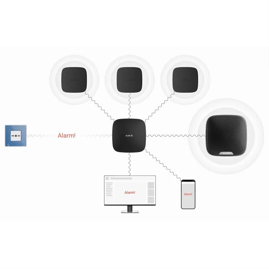 ManualCallPoint je bezdrátové tlačítko určené k vyvolání požárního poplachu. Po stisktnutí se spustí všechny požární detektory v systému a dojde k automatickému informování uživatele a CMS. Všechna relevantní data jsou okamžitě k dispozici v aplikaci Ajax, včetně informací o spuštění, času a místě. V případě život ohrožující situace dojde k aktivaci inovativních funkcí jako je odpojení zařízení, aktivace nouzového osvětlení a odemčení východů.