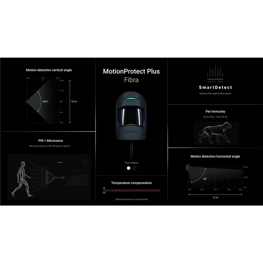 MotionProtect Plus Fibra je drátový detektor pohybu s PIR senzorem na vzdálenost 12 metrů. Zařízení navíc disponuje mikrovlnným senzorem, který snižuje výskyt falešných poplachů způsobených tepelnými interferencemi – krb, topení, klimatizace atd. Samozřejmostí je PET imunita – ignorování pohybu domácích zvířat. Detektor je určen pro použití v interiéru a dosah drátového připojení je až 2 000 metrů.