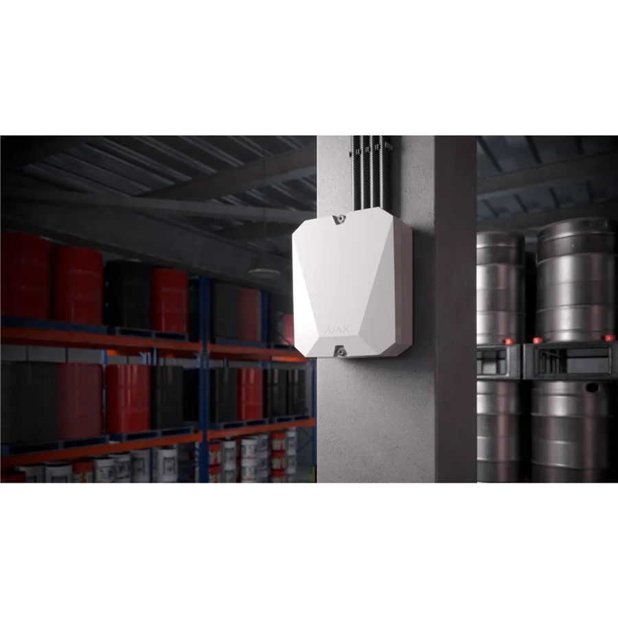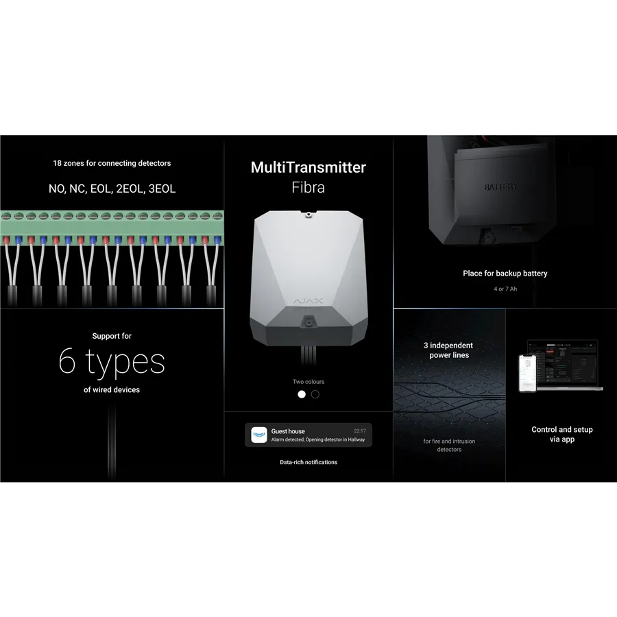 Integrační jednotka Multitransmitter Fibra umožňuje spárovat až 18 drátových detektorů třetích stran s bezpečnostním systémem Ajax. Zařízení disponuje 18 vstupními svorkami pro připojení zařízení typu NO, NC, EOL, 2EOL, 3EOL a vyhrazenou napájecí větví pro připojení požárních detektorů.