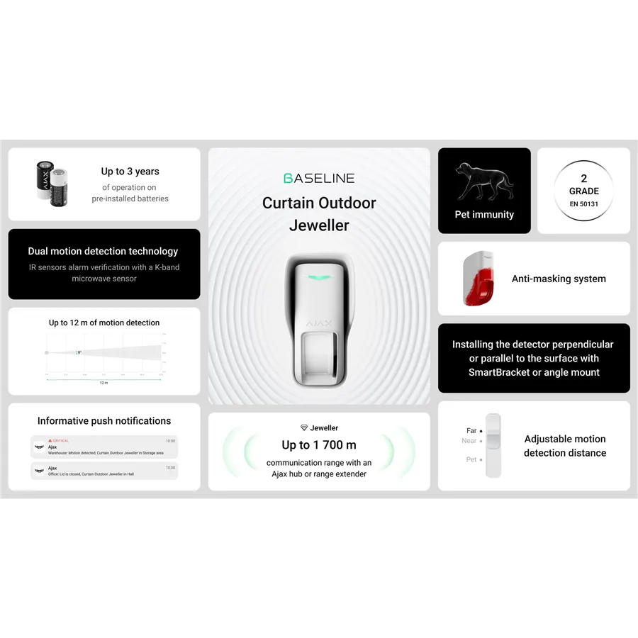 Ajax Curtain Outdoor je bezdrátový venkovní detektor pohybu se záclonovou detekční charakteristikou. Dva PIR senzory a jeden MW senzor zaručují efektivní detekční zónu v rozsahu 8-12 metrů. Účinně tak zastřežíte dveře, okna, zádveří a další otvory uvnitř i na vnějším plášti objektu. Přístroj disponuje ochranou proti blokování (antimasking) a při správném nastavení a instalaci ignoruje pohyb zvířat.