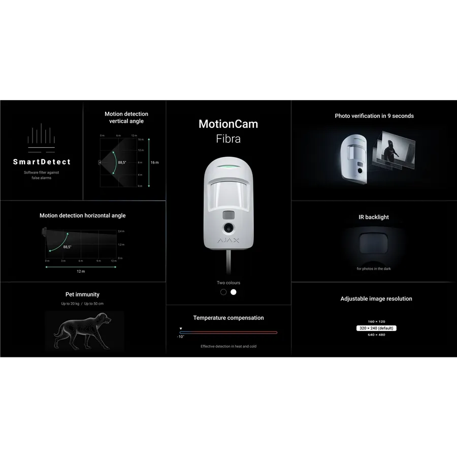 MotionCam Fibra je vnitřní drátový detektor pohybu s foto verifikací poplachu. Zařízení detekuje pohyb až na vzdálenost 12 metrů, samozřejmostí je PET imunita (odfiltrování pohybu domácích zvířat). Kamera se aktivuje pouze v reakci na vyvolaný poplach a pořídí sekvenci 5 snímků během jedné poplachové události.
