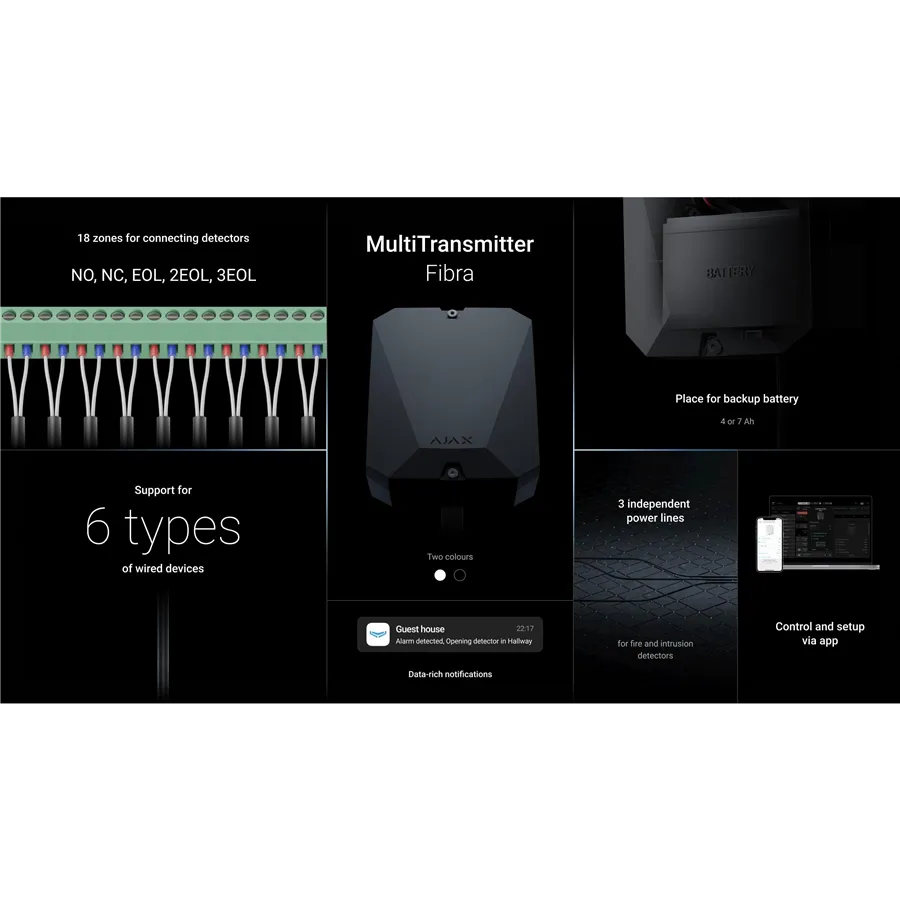 Integrační jednotka Multitransmitter Fibra umožňuje spárovat až 18 drátových detektorů třetích stran s bezpečnostním systémem Ajax. Zařízení disponuje 18 vstupními svorkami pro připojení zařízení typu NO, NC, EOL, 2EOL, 3EOL a vyhrazenou napájecí větví pro připojení požárních detektorů.