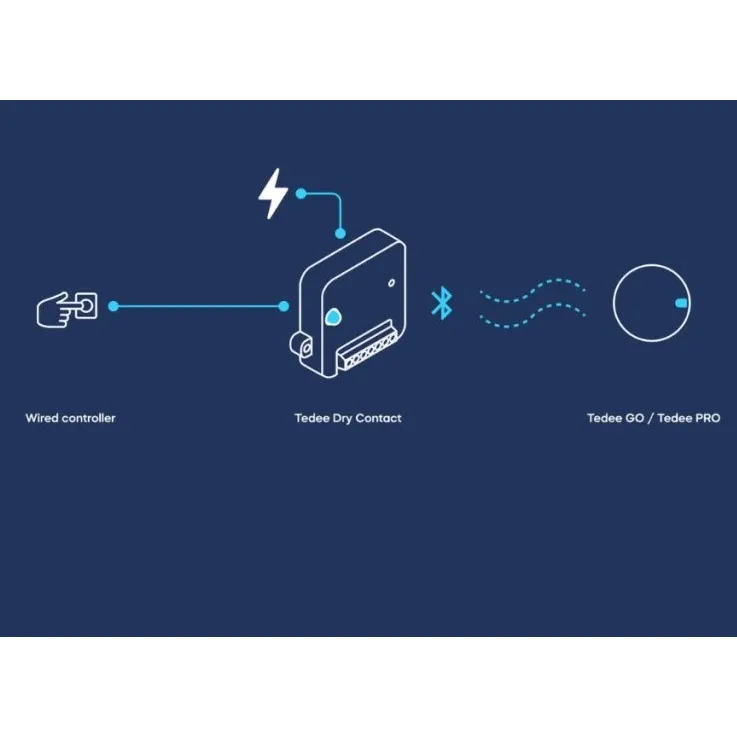Tuto jednotku velikosti krabičky od sirek lze zapojit do jakékoli kompatibilní sestavy suchých kontaktů. Tedee Dry Contact, který funguje na základě výstupů řídicího zařízení, usnadňuje zamykání a odemykání zámků tedee GO nebo PRO prostřednictvím Bluetooth – bez nutnosti použití mostu tedee bridge, připojení k internetu nebo integrace API/SDK. Každé zařízení při tom ovládá pouze jeden chytrý zámek, nahrazuje typický cloudový bezpečnostní systém Tedee a digitální ověřování alternativním, kabelovým způsobem přístupu.